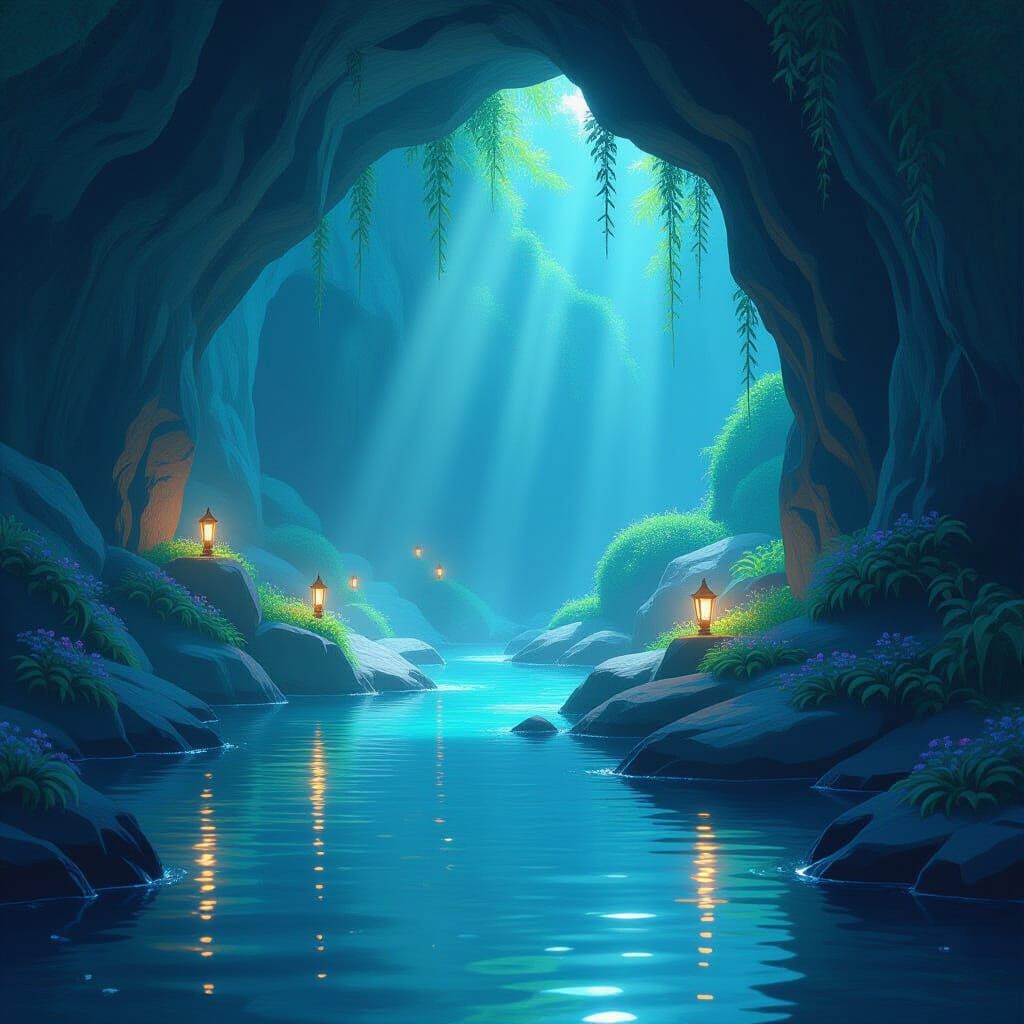 A peaceful grotto scene featuring a small stream with light reflections. The image has a dreamlike quality, with vibrant colors and an ethereal atmosphere, in a painterly style.
