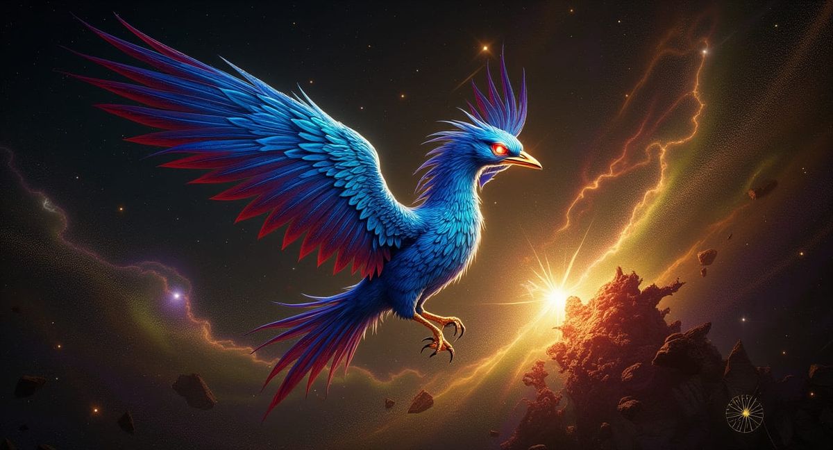 This image shows a crystal phoenix soaring through a nebula. The phoenix has sapphire and ruby feathers, and the nebula is filled with stardust and cosmic debris, rendered with detailed textures and lighting in a digital art style.