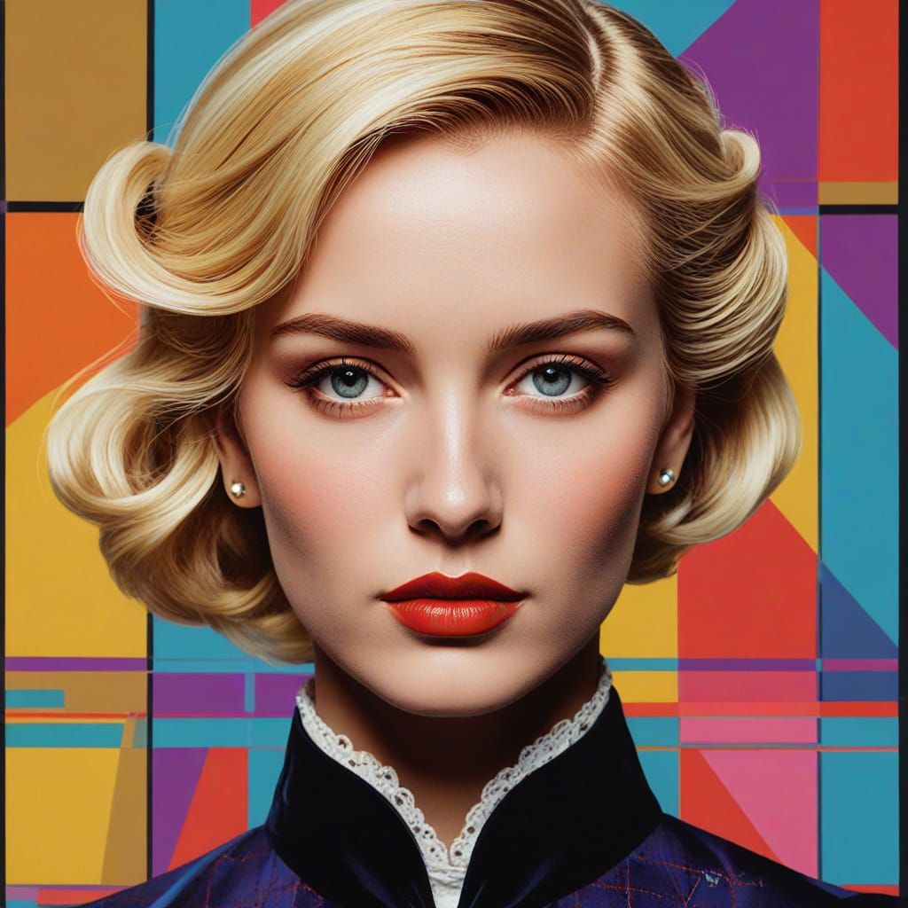 This image features a close-up of a blonde woman in Victorian clothing, rendered in a screen print style with bold outlines and vibrant color blocks. The composition is symmetrical with a stark geometric background.