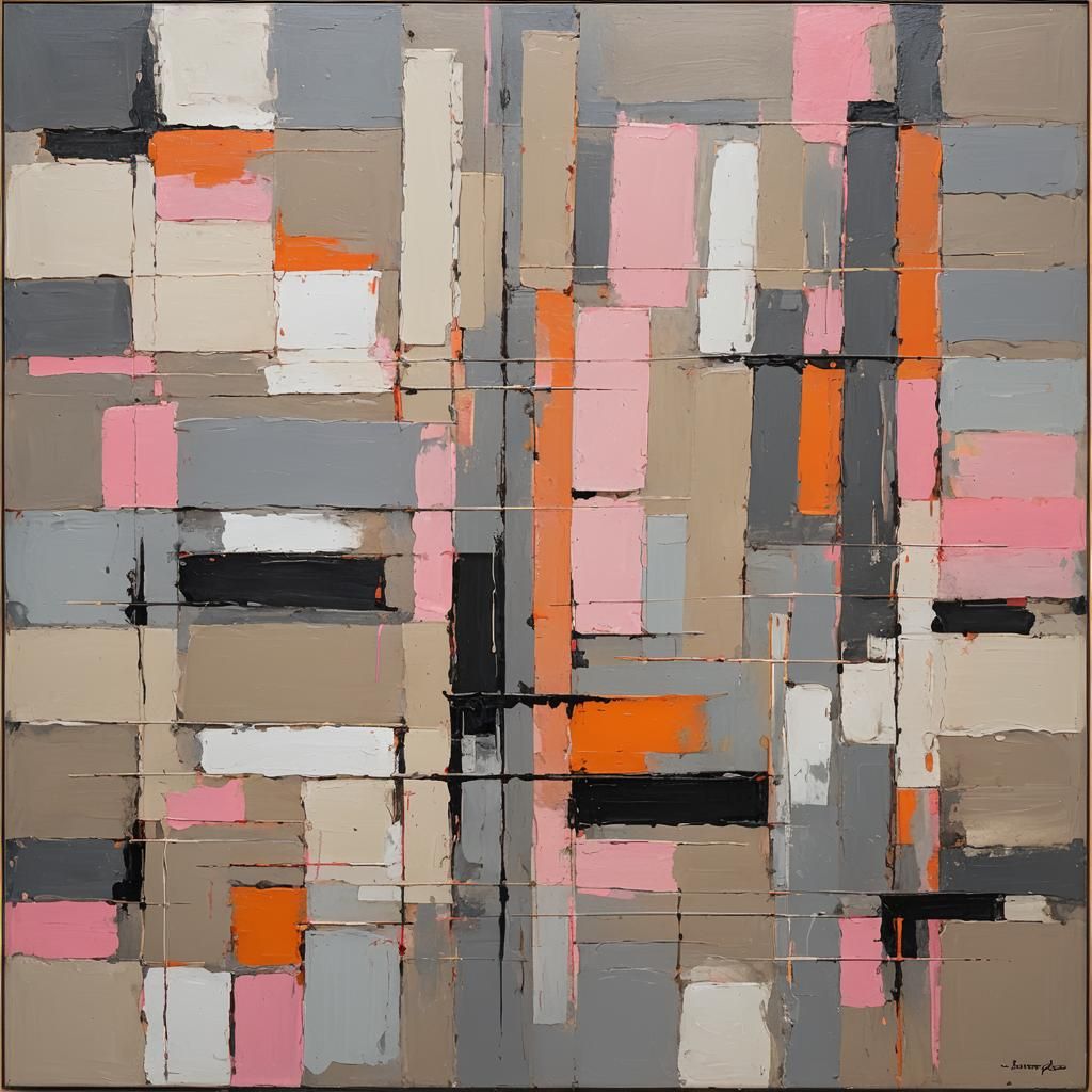 This image shows complex geometric shapes in coffee, beige, grey, pink, orange, and taupe tones, accented with neon, in an abstract acrylic and oil painting style.