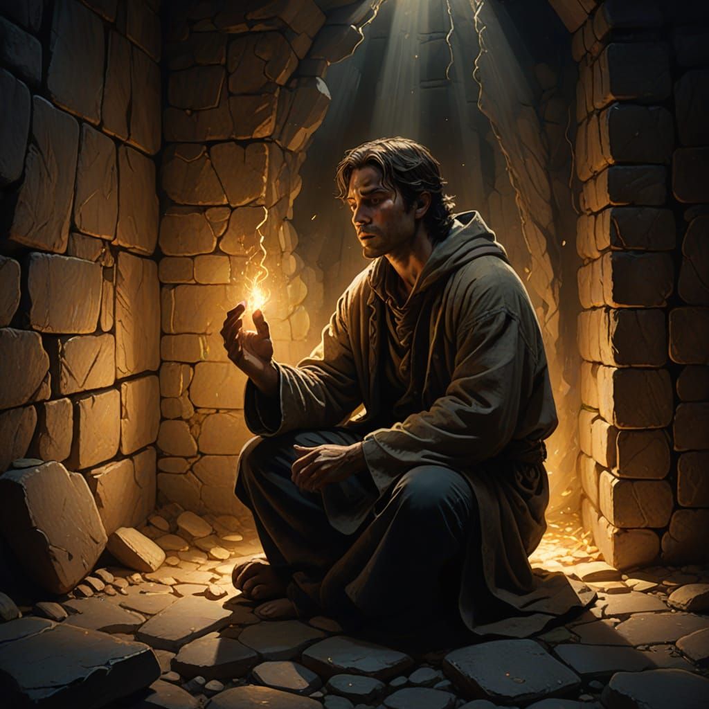 This evocative digital painting shows a person rising from slumber, pleading with a fervent heart as golden light spills through a stone wall crack. Cinematic and atmospheric.