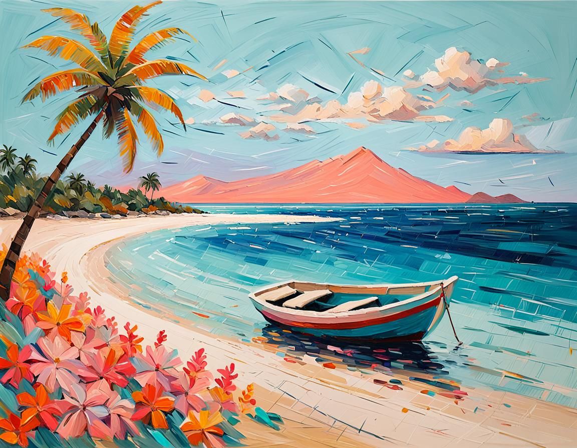 A vibrant seascape featuring a lone boat approaching an island. The scene is rendered with textured brushstrokes and luminous colors in an impasto style, reminiscent of coastal realism.