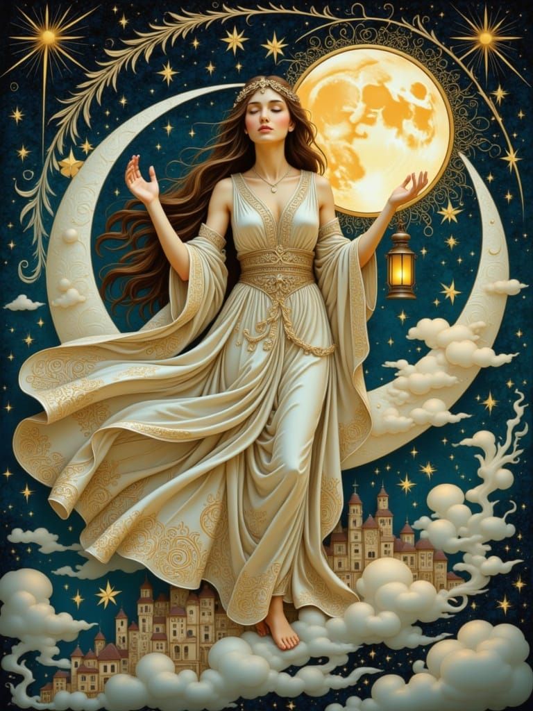 A radiant moon goddess watches over a sleeping village. She is depicted in flowing robes with swirling clouds and stars, styled as folk art nouveau.