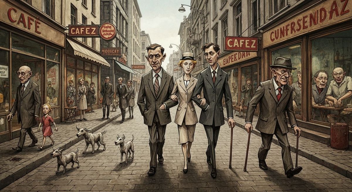 This image depicts a lively urban scene with grotesque, angular figures in a satirical German Expressionist Dada style. It captures a distorted parody of a leisurely Sunday afternoon with a muted, gritty color palette.