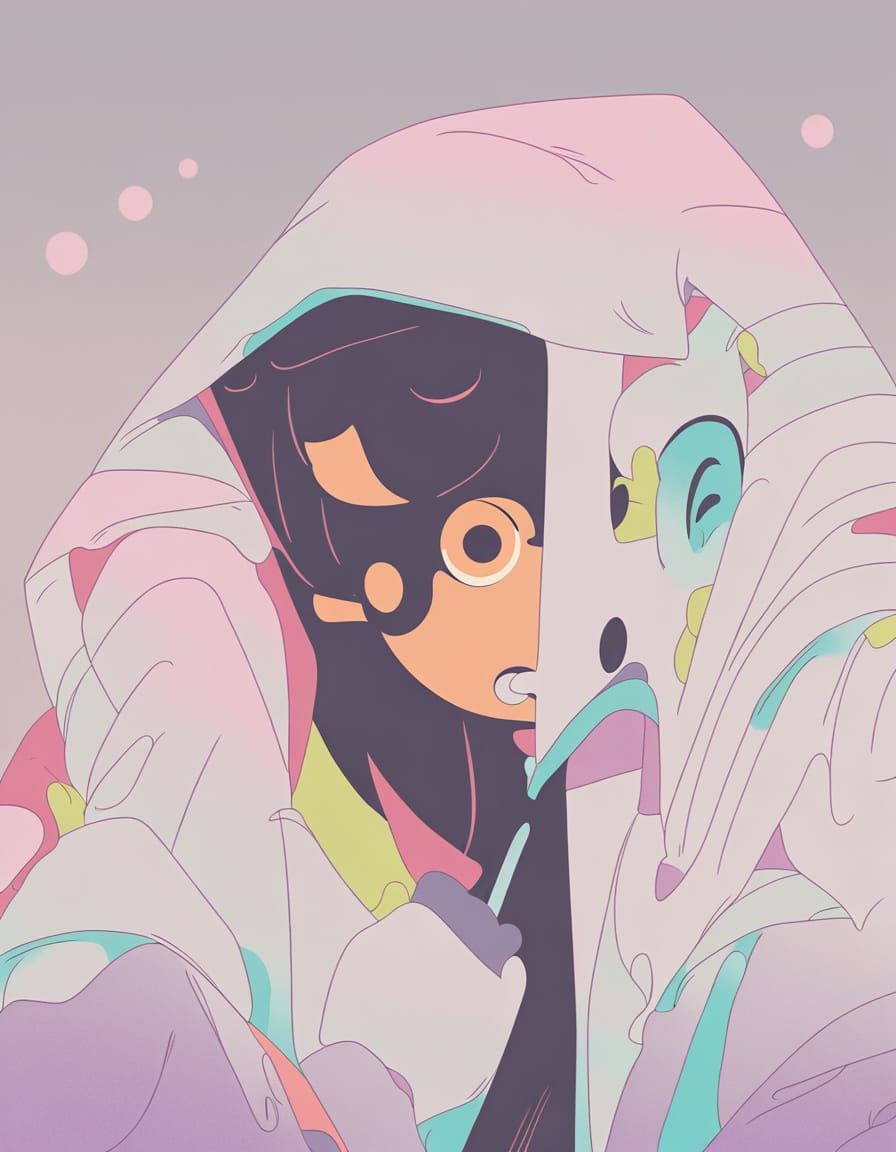 This image shows a close-up, manga-style portrait of a person with bright, vibrant eyes and colorful hair. The artwork features bold lines and flat colors in a pastel color scheme, in a cartoonish style.