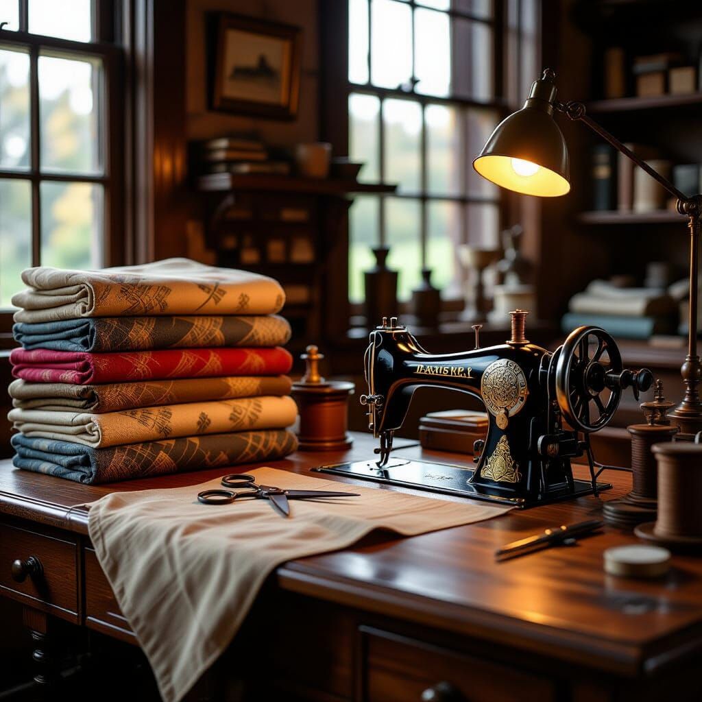 A highly detailed concept art piece, influenced by the rich textures of oil painting, depicting a cozy, antique tailor's workbench. Bolts of fabric are neatly stacked, a pair of tailor's sheers rests beside them, and a vintage sewing machine sits ready for use. Warm, directional lighting illuminates ...