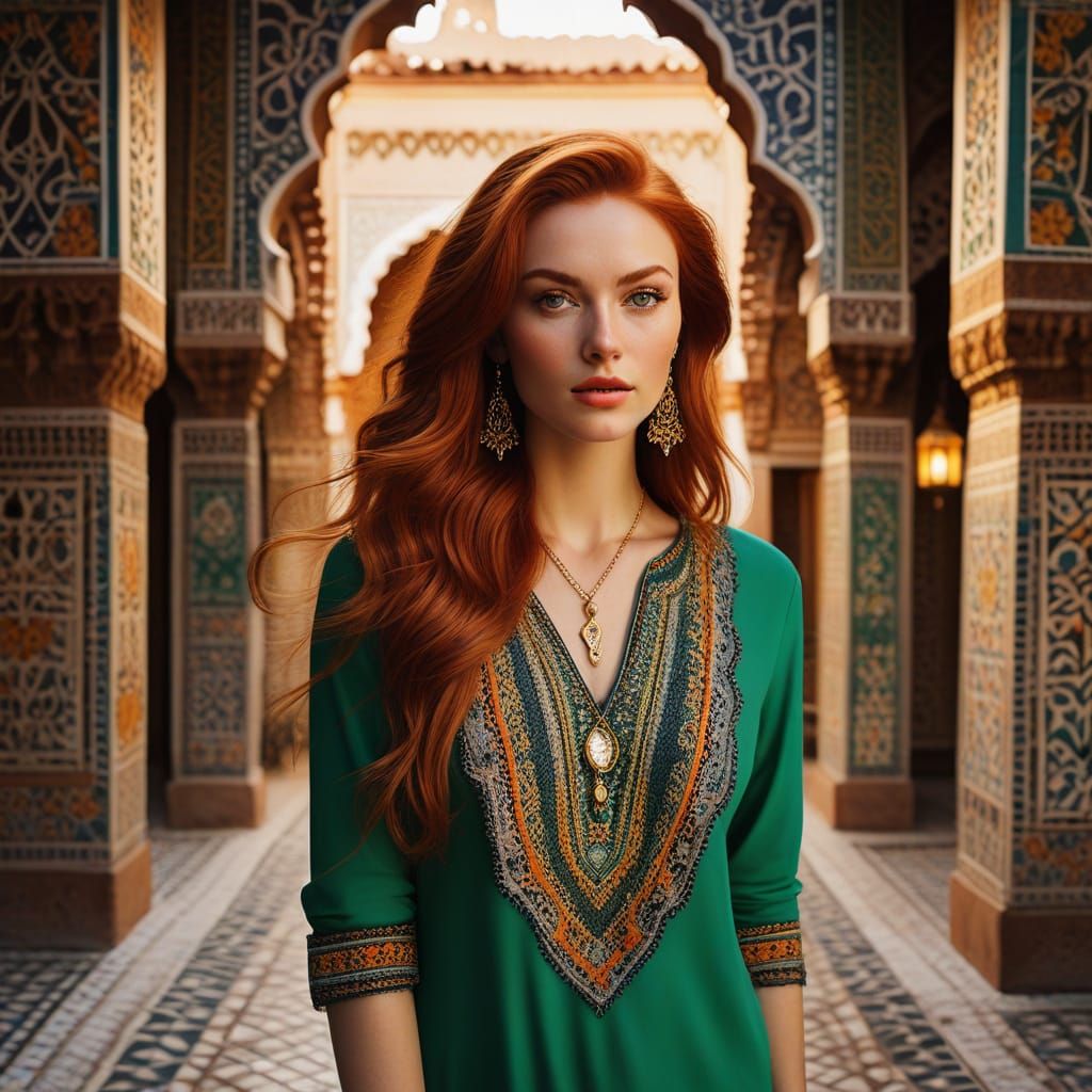 A striking picture of a beautiful woman with long auburn hair and green eyes in a Moroccan courtyard. Gold jewelry glints in the soft, warm light, in a vibrant Matisse-inspired style.