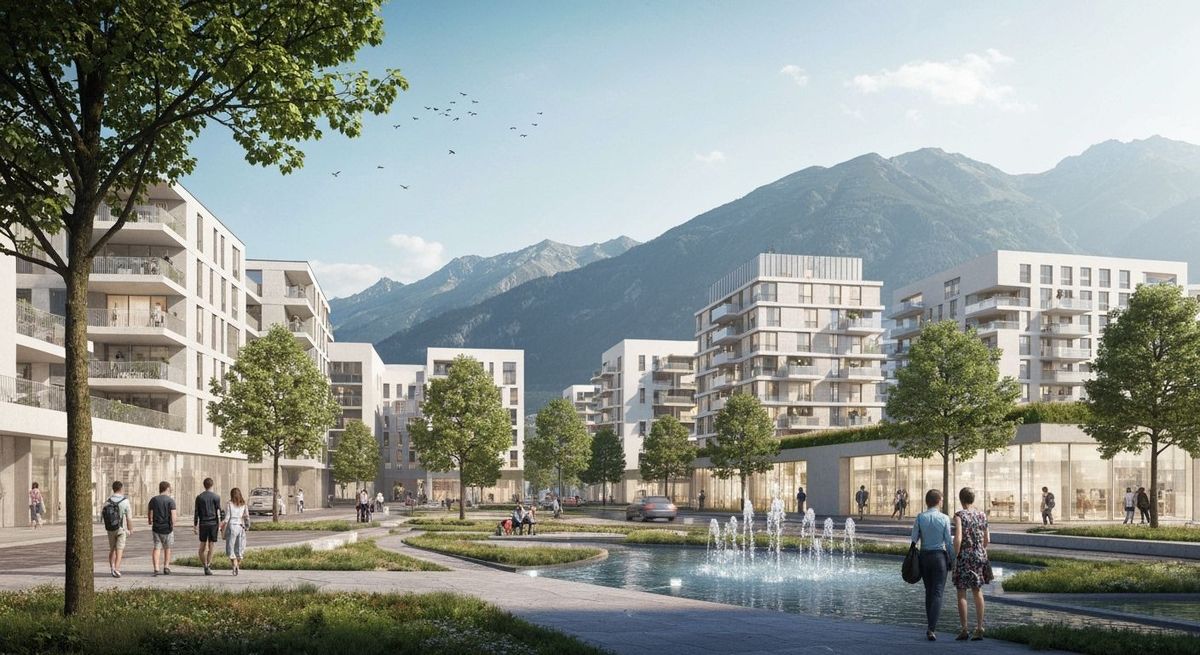 This image showcases a sustainable city in Innsbruck, Austria, featuring modern residential buildings with balconies against the Tyrolean mountains, rendered photorealistically with parametric architectural elements.