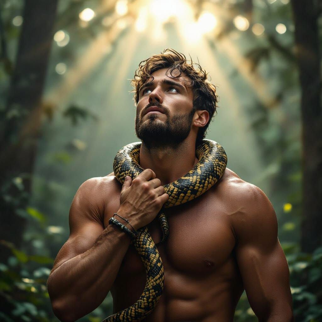 A dramatic image showing a muscular man holding a snake around his neck in a misty forest with a yellow-tinged sky. The scene is illuminated by rays of light.