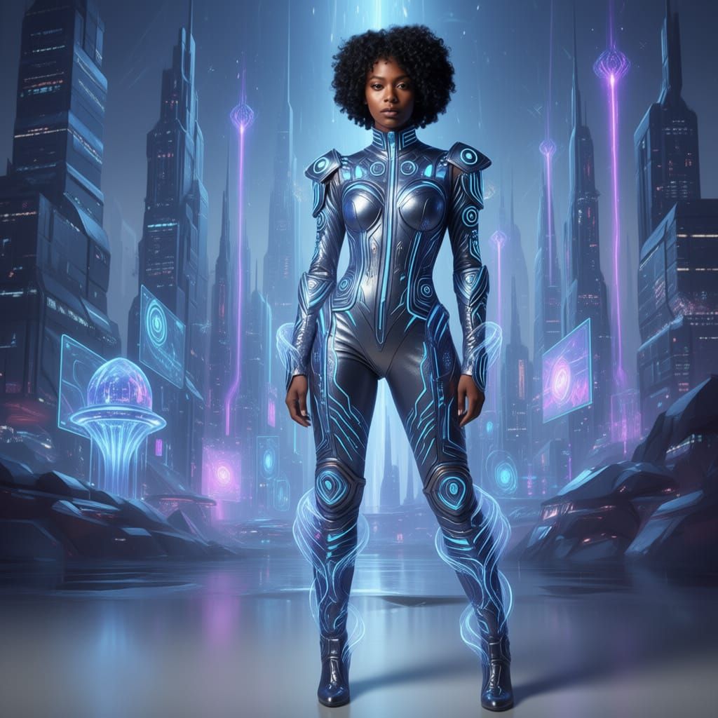 This image features an African woman with short curly hair and striking brown eyes, adorned in a unique, full-body outfit and matching boots.