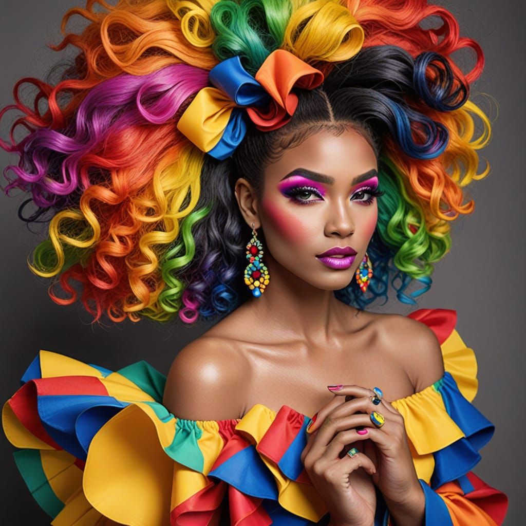 This image is a vibrant portrait of a young woman with rainbow-colored hair, bold makeup, and colorful accessories, showcasing a playful and artistic aesthetic.