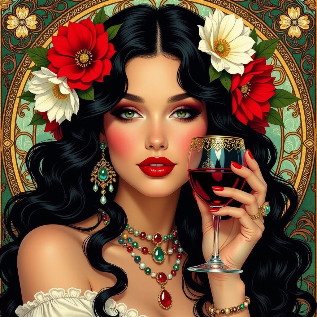 A shoulder-up portrait of a raven-haired woman adorned with flowers and jewelry, holding a wine glass. The image blends art nouveau elegance with vibrant pop surrealism, rendered with delicate, fantasy-style details.