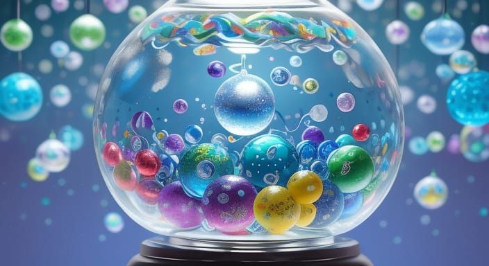 This image depicts a colorful glass gumball machine with a whimsical face expression, surrounded by shimmering magical orbs and ultra-detailed glasswork in the background, showcasing a unique blend of artistry and technical skill.