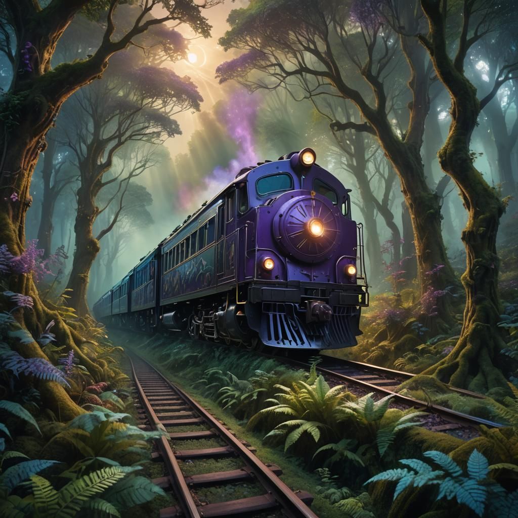 A detailed matte painting of a fantastical rail train speeding through a mystical forest. The image is a vibrant fantasy concept art with intricate details and deep colors, reminiscent of steampunk industrial design.