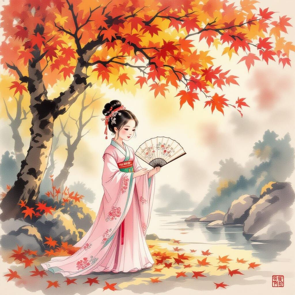This image depicts a young Chinese girl in a traditional pink dress, holding a fan under a colorful autumn tree. Rendered in a Chinese ink wash style with warm tones and soft light.