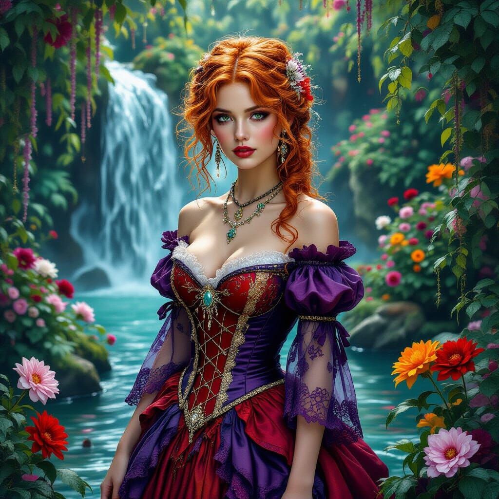 alcohol ink painting on silk, sprayed with Luminol, Pre-Raphaelite lady with messy orange hair, purple and red lace gown, fancy jewels, garden, flowers, waterfall, wet botanical, emotional, moody, romanticism, hdr