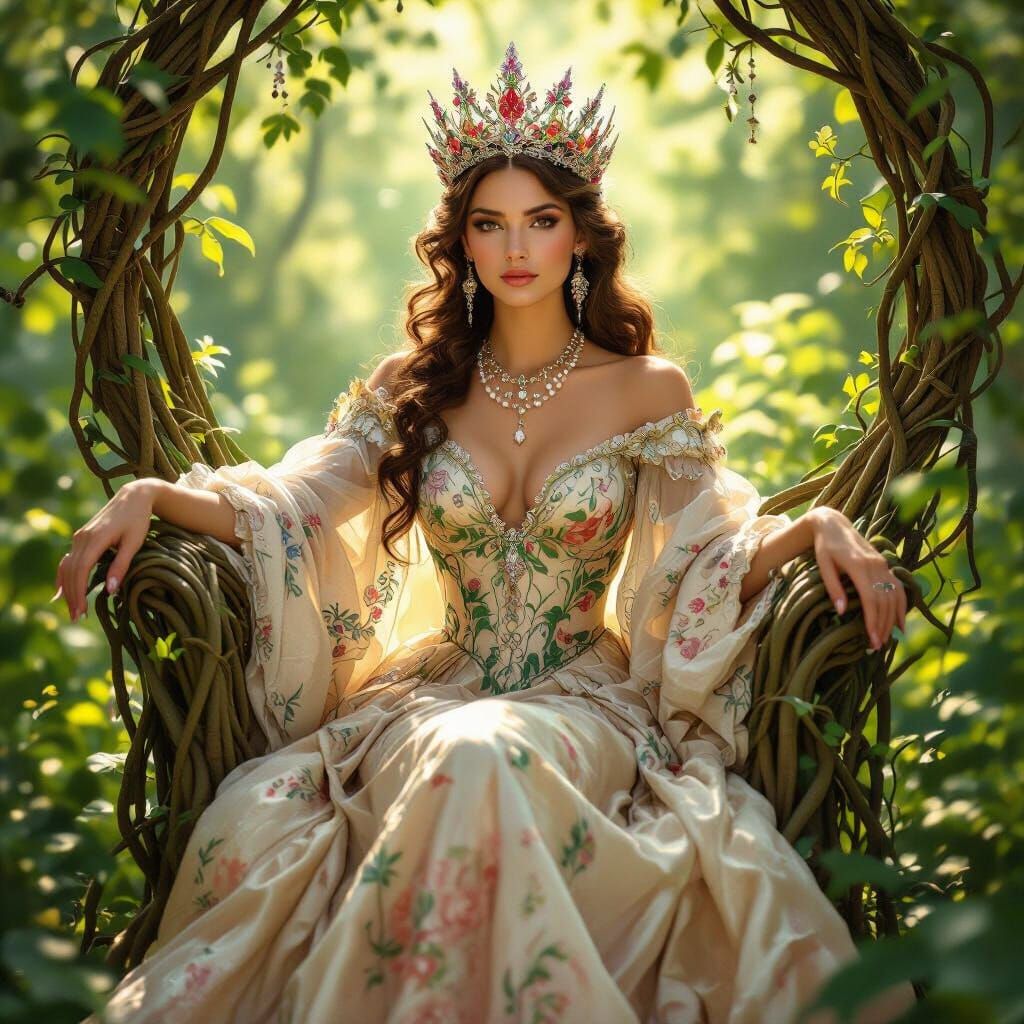 A striking picture of a queen on a vine throne in a sunlit forest. This image showcases an Art Nouveau style with flowing lines, intricate details, and golden tones.