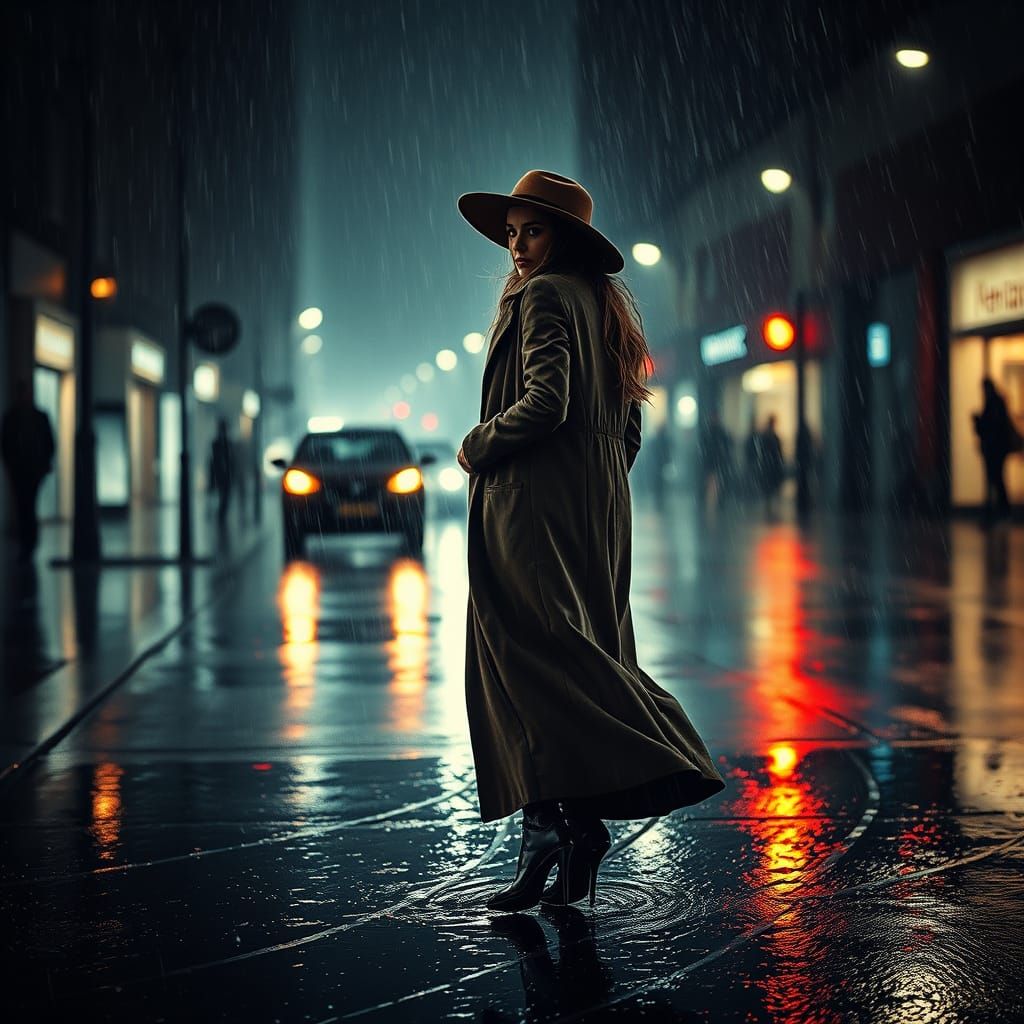 A cinematic image of a woman in a long coat braving a downpour. The scene is lit with dramatic lighting and vibrant colors, enhanced by atmospheric textures.