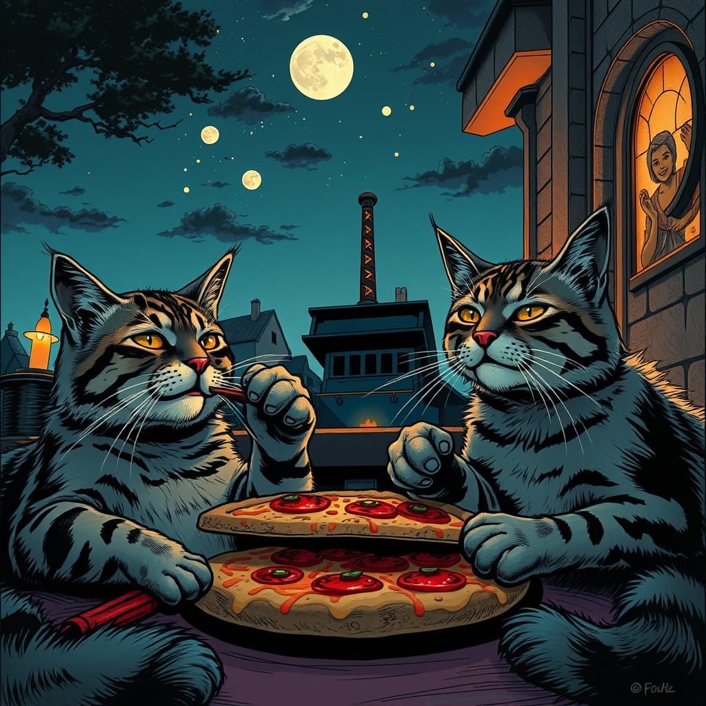 This image shows samurai cats joyfully eating pepperoni pizza. The artwork is reminiscent of comic book art with smooth lines and a perfect finish.