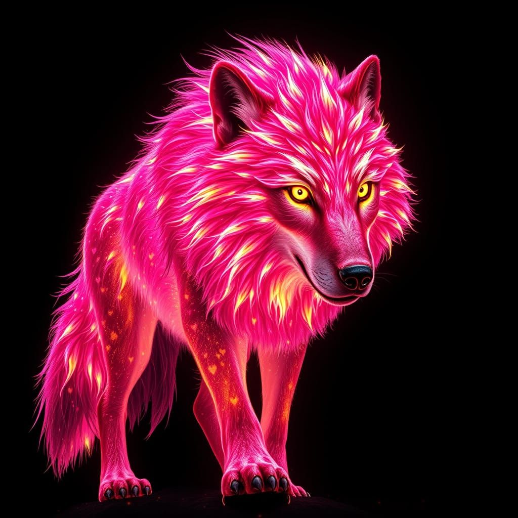 This image shows a mythical wolf with neon fur in shades of pink, gold, and crimson, glowing against a black background. The hyper-detailed image is rendered with cinematic lighting and an ultra-realistic style.