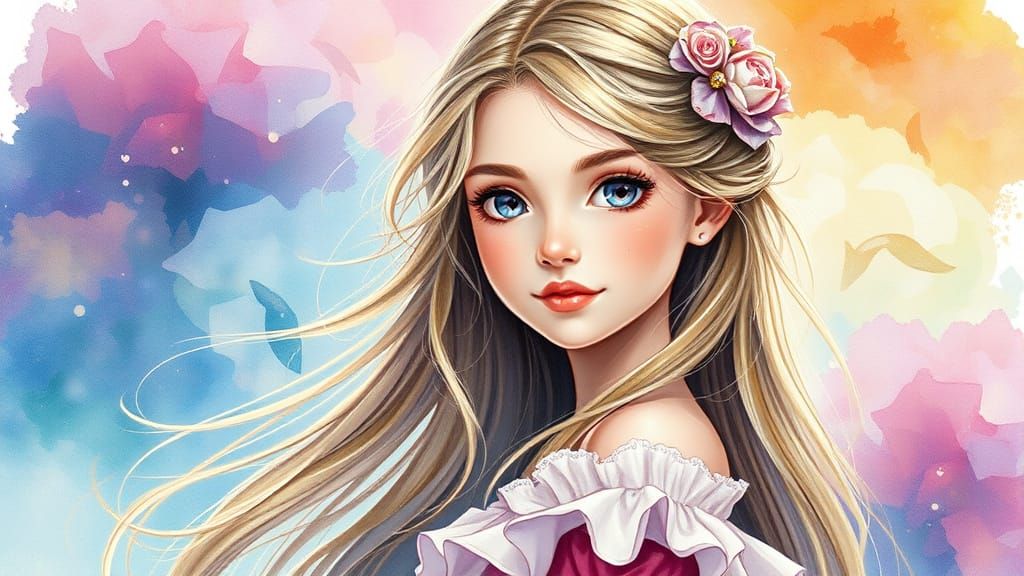This image shows an enchanting girl with delicate features and long, flowing hair. The portrait, in watercolor style, features soft pastel colors and dramatic side lighting.