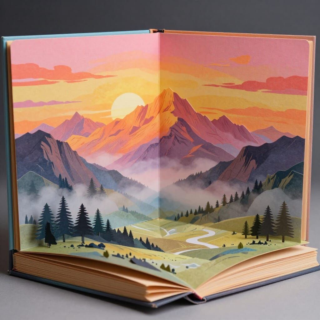 Easily generate unique popup book images of mountains and sunrises with our free AI tool. Bring your stories to life!