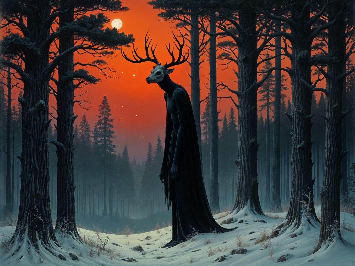 This image depicts a tall, gangly humanoid with a deer skull head and obsidian antlers in a shadowy, foggy winter glade. The menacing sky glows red and purple, with chiaroscuro lighting highlighting the figure in muted, dark tones.