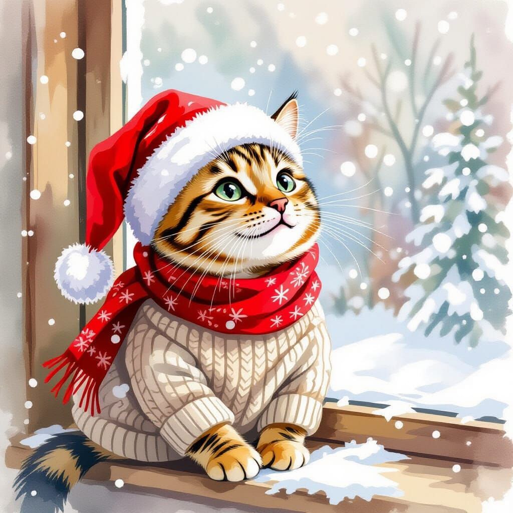 This charming watercolor illustration features a Bengal cat in festive attire, happily observing falling snow from a cozy windowsill. The art style is whimsical and dreamlike.