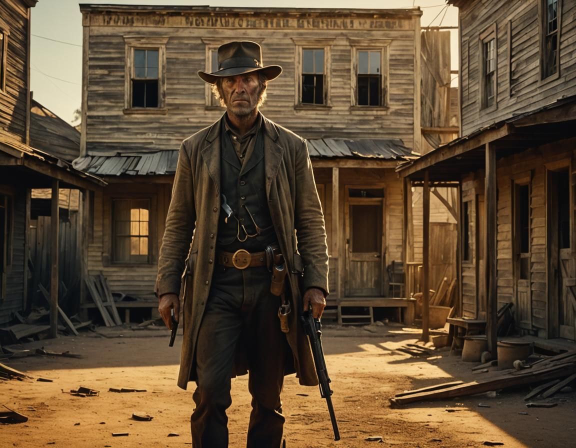 A striking picture of a fierce outlaw backlit by a setting sun in a rundown 19th-century town. Shot with warm earthy tones, deep shadows, and soft light, in the style of Australian tonalism.