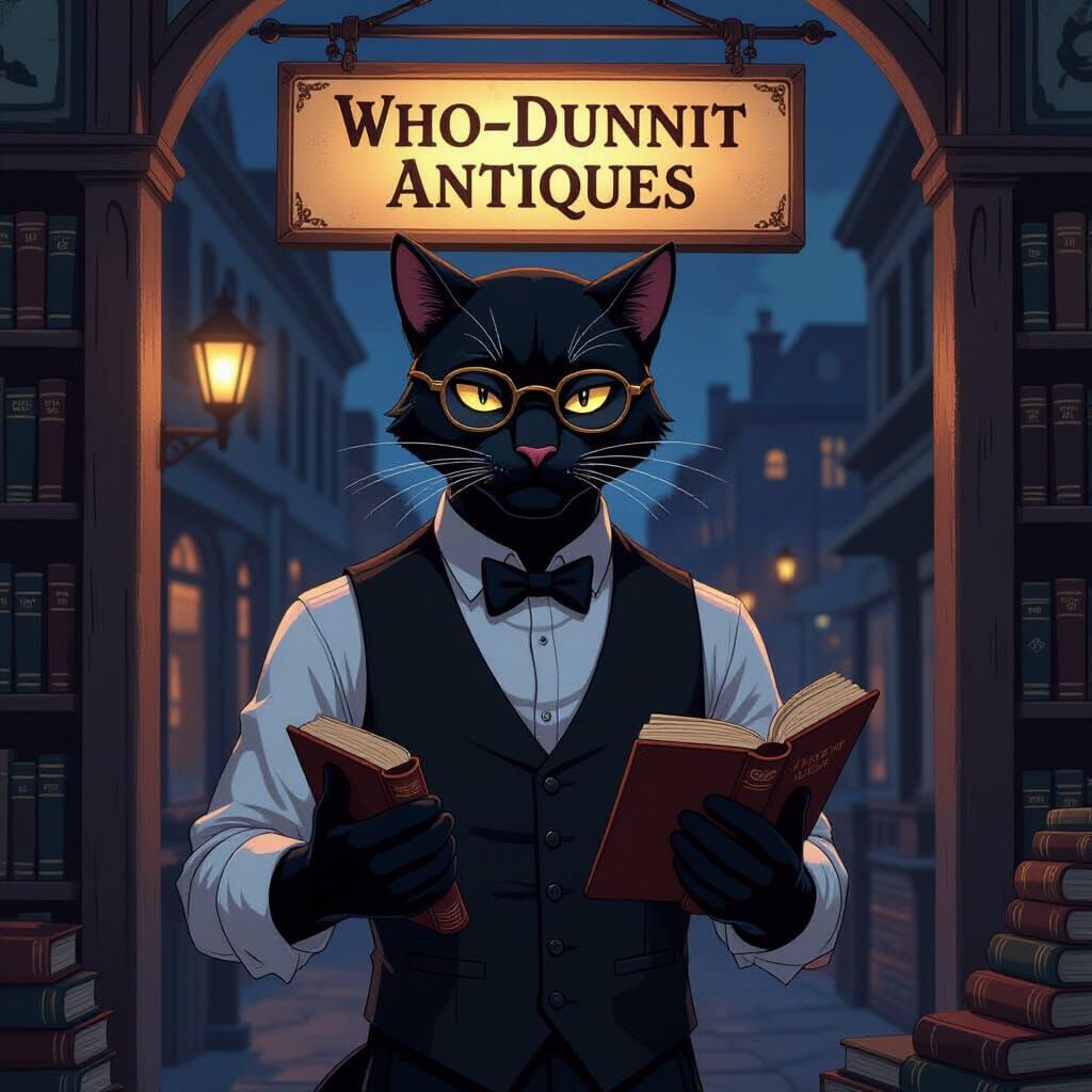 A skinny anthropomorphic black panther man in a waistcoat and glasses holds antique books in a dimly lit store. Rendered in a flat manga scan, anime style with cel-shading.
