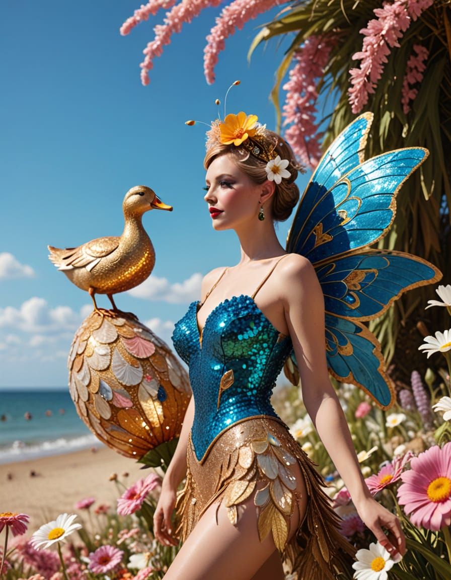 This image shows a futuristic showgirl in a vintage cabaret setting, complete with feathers, sequins, and glitter. The performer is under dazzling stage lights in a shimmering, colorful costume. The image is reminiscent of a fantasy stage act.