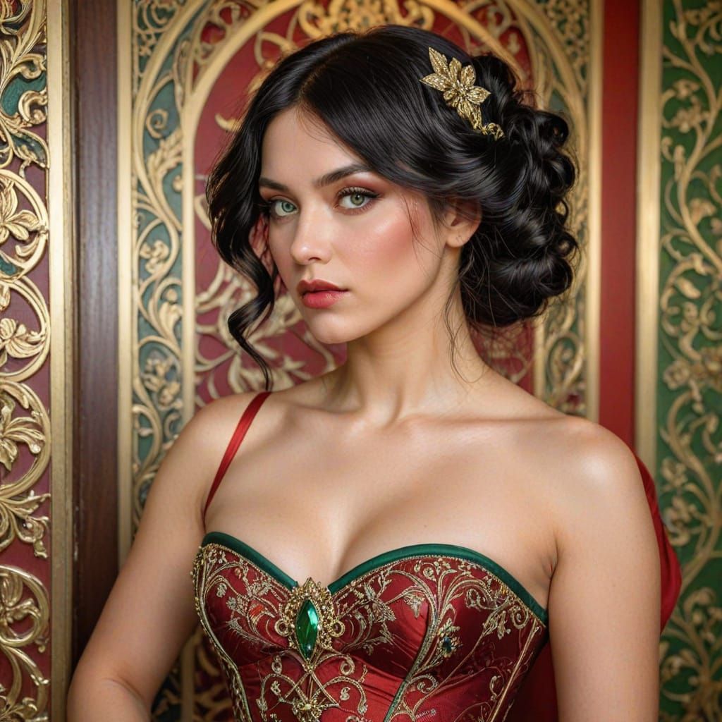 This image showcases a woman with dark hair and green eyes in a red, regency-era dress. The artwork features mystical flourishes, sensual curves and golden accents in an Art Nouveau style.