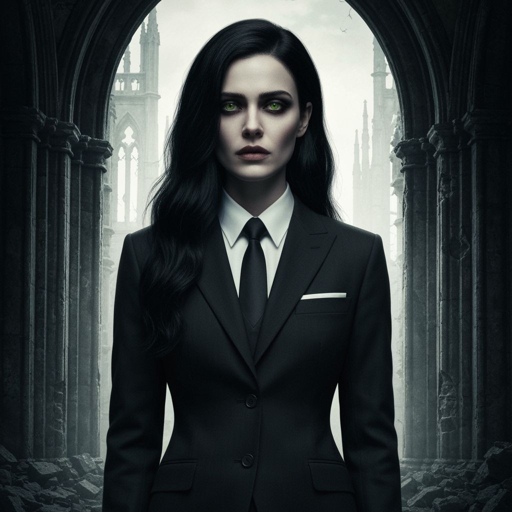 A surreal image of a slender woman resembling Nyarlathotep, her striking red eyes piercing through dark hair. She wears a tailored dress suit in a dark surrealist style, with cinematic lighting.