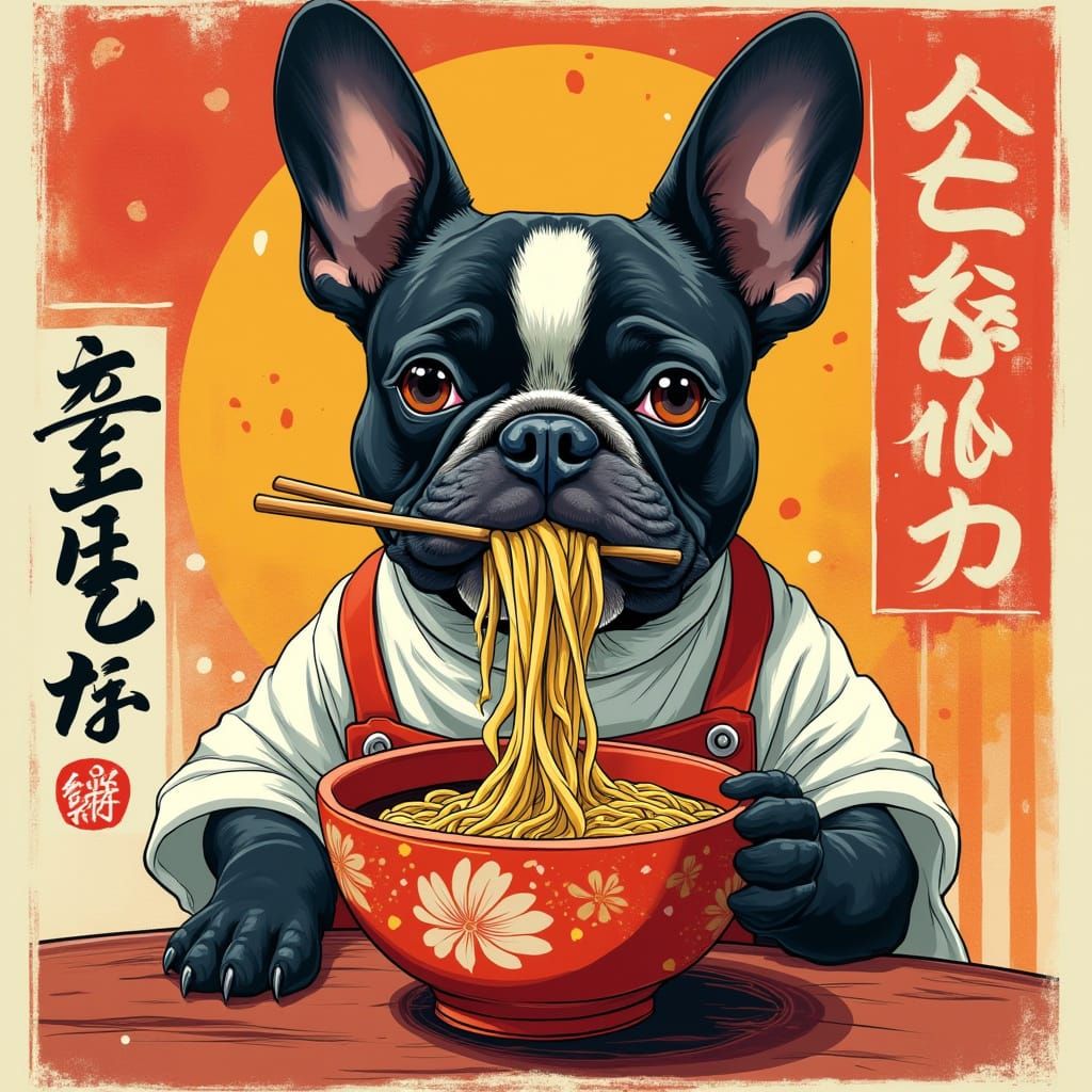 This image is a colorful, graphic illustration of a French bulldog enjoying noodles in a style reminiscent of 1960s Japanese advertising posters, blending traditional and anime elements.