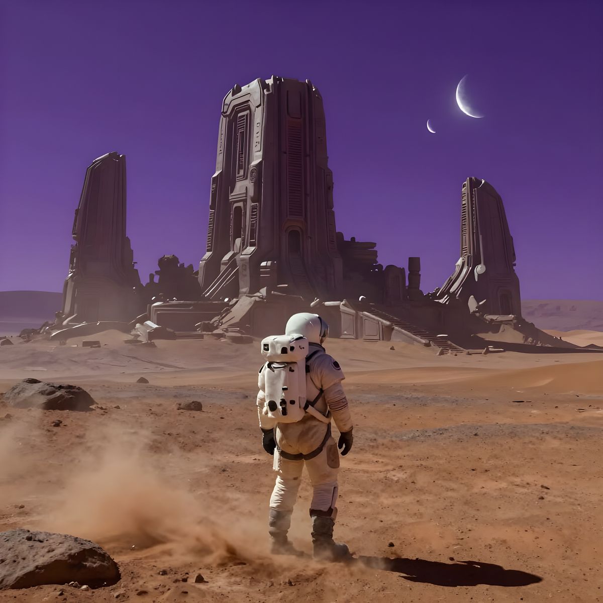 This image shows a lone astronaut on a desolate, Mars-like world, gazing at vast, ancient alien structures under a vibrant purple sky with two moons. Realistic style with atmospheric lighting.