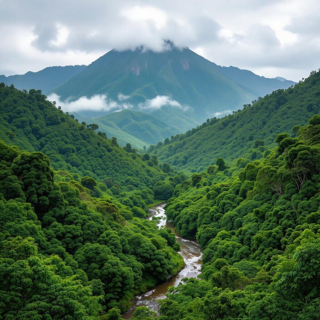 This image shows a vibrant green forest with a winding river flowing through it. Steep, rugged mountains surround the forest under a damp, rainy sky. The landscape is reminiscent of classic nature photography.