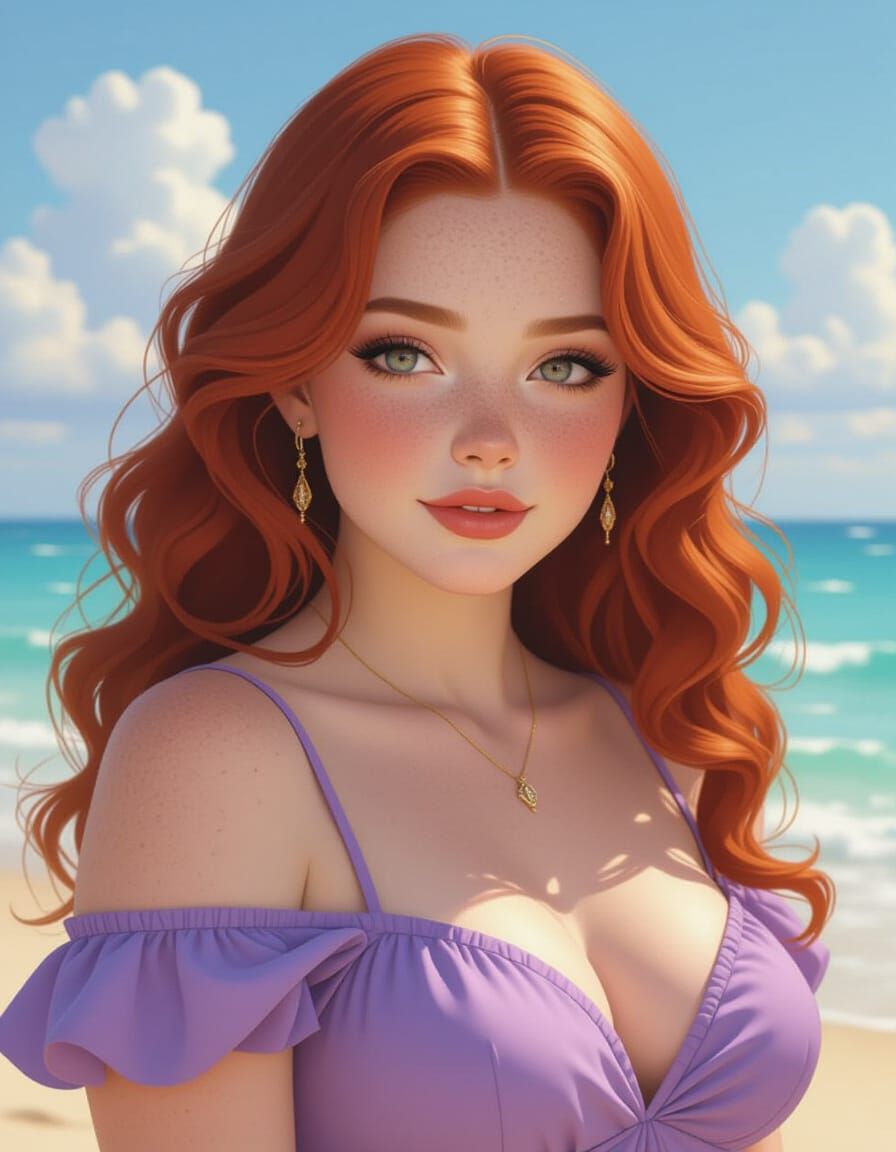 A striking portrait of a freckled teenwoman with red hair on an Italian beach, captured in a moody, noir aesthetic with deep colors and light blue shadows. Rendered with intricate detail and a delicate palette.