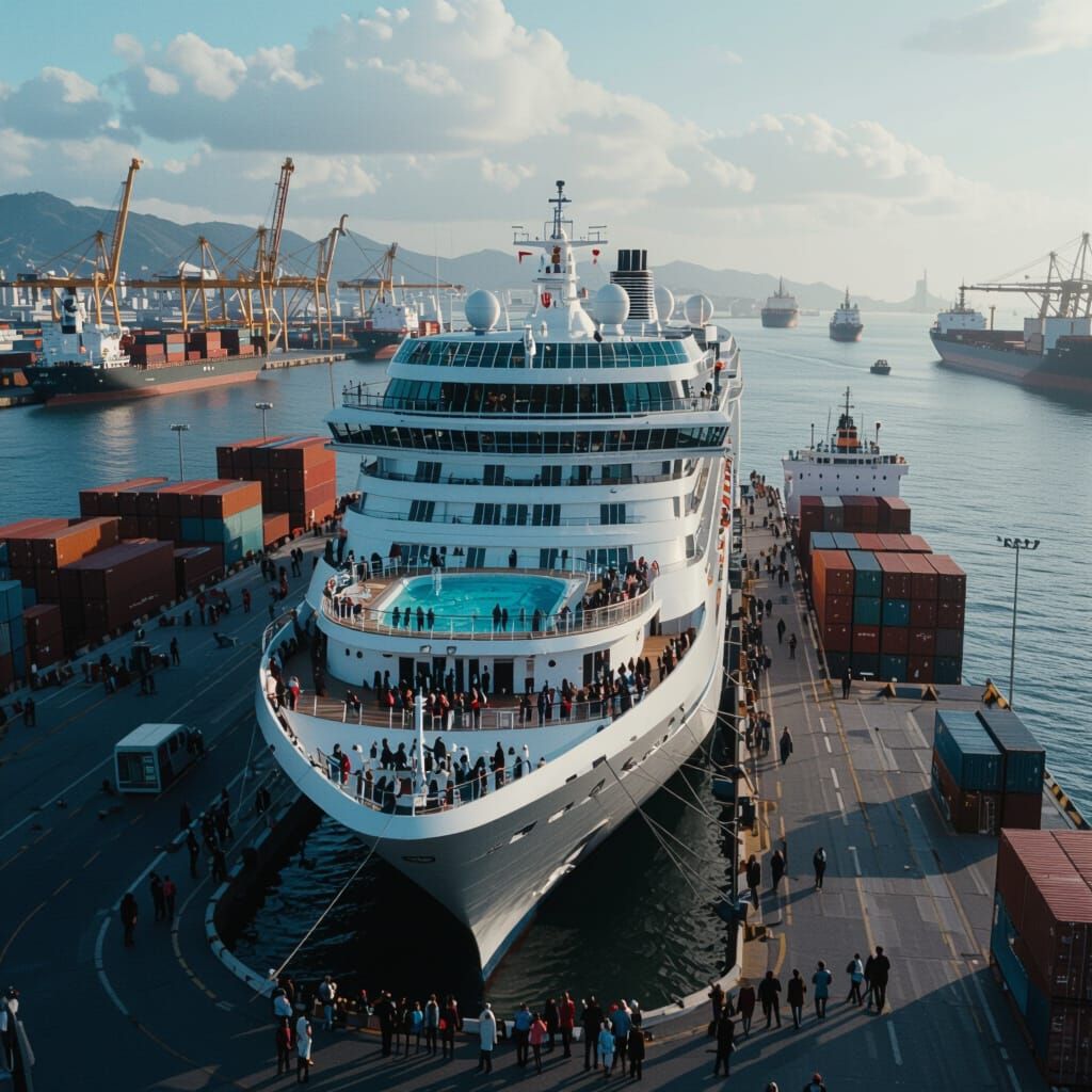 This image showcases a large cruise ship docked in a busy harbor. Passengers line the railings, and a pool is visible on the top deck. The scene is rendered with cinematic film grain and lighting.