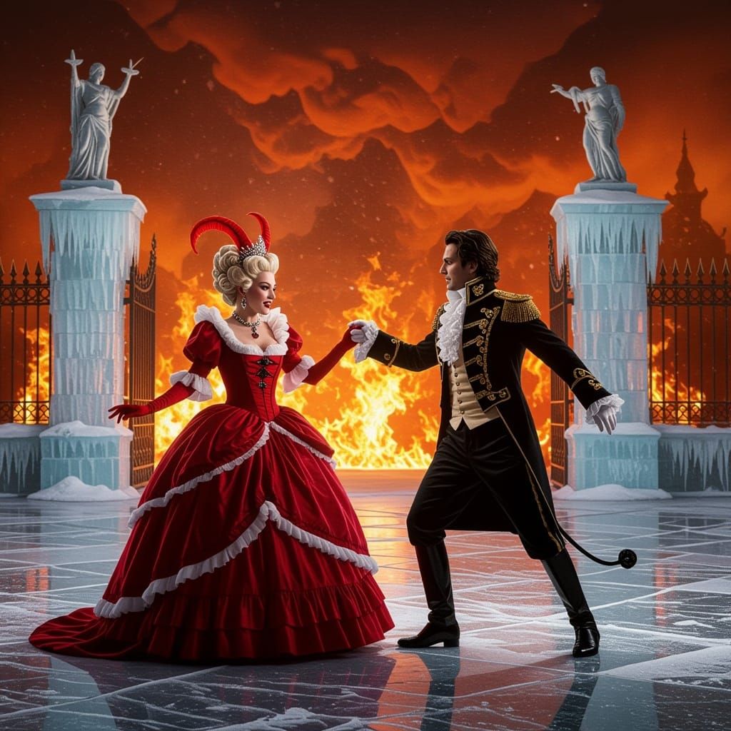 A radiant, fiery Marie Antoinette dances with a French Courtier before the Gates of Hell.