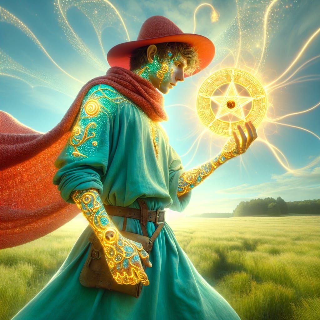 This image shows a young man in a tunic examining a golden pentacle in a field. The surreal scene blends ancient design with futuristic technology, featuring tribal light-code tattoos and hyper-realistic details.