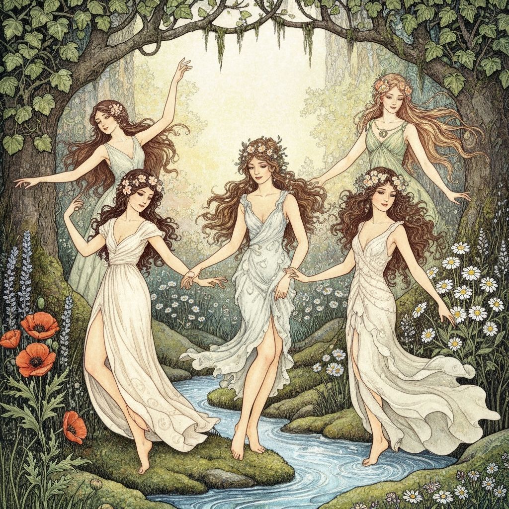 This image depicts beautiful nymphs in a fantastical setting. The artwork evokes a golden age illustration style, reminiscent of classic fairy tale art.