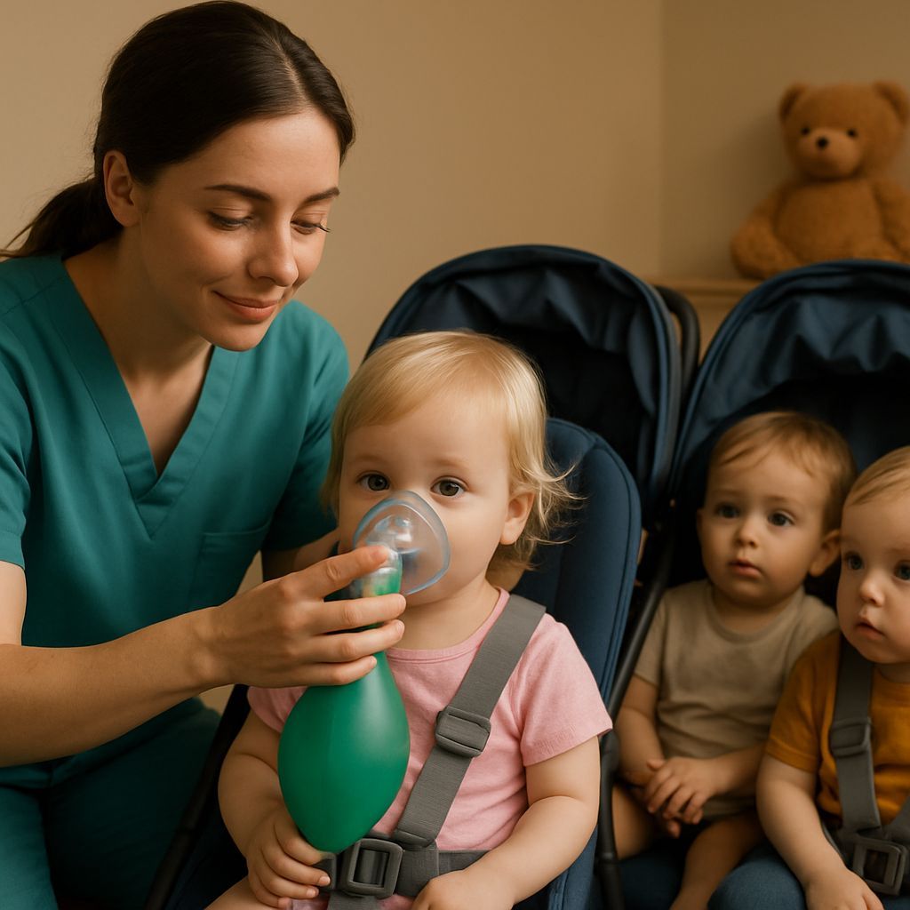 This image shows a nurse placing an anesthesia mask on a curious toddler in a stroller, with other children watching. The scene is set in a softly lit room with medical equipment.