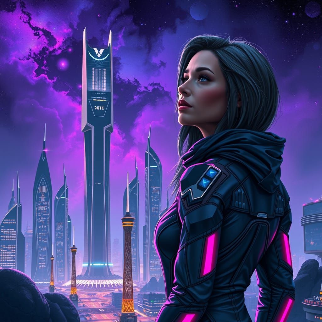 A digital artwork of a futuristic woman in a metallic jumpsuit looking at a neon cityscape under a purple and blue nebula. The image has a dark, gritty texture with a strong science fiction aesthetic.