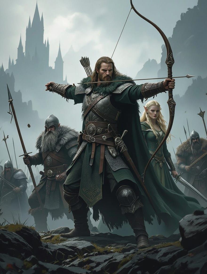 A heroic archer and his companions stand united against the dark forces of orcish hordes in this epic fantasy movie poster, set against a misty backdrop with intricate designs, ornate armor, and dramatic lighting, reminiscent of digital art and fantasy illustrations with a cinematic scope.