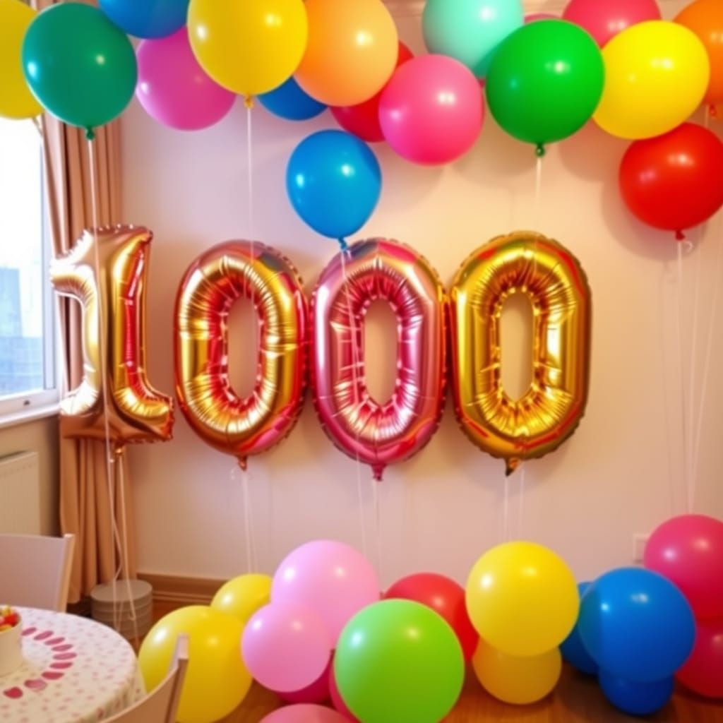 This image shows celebratory balloons spelling out the number 1000 at a festive children's party. The scene captures the joy and excitement of a milestone celebration.
