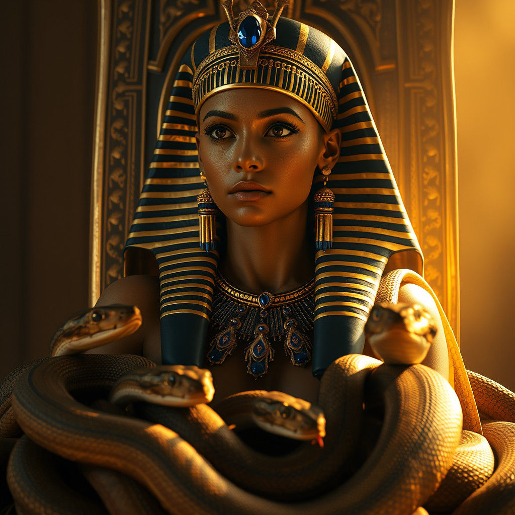 A striking picture of Cleopatra with snakes coiled around her throne. The image blends ancient Egyptian elements with modern photorealism, shot in hyperrealistic detail with a cinematic feel.