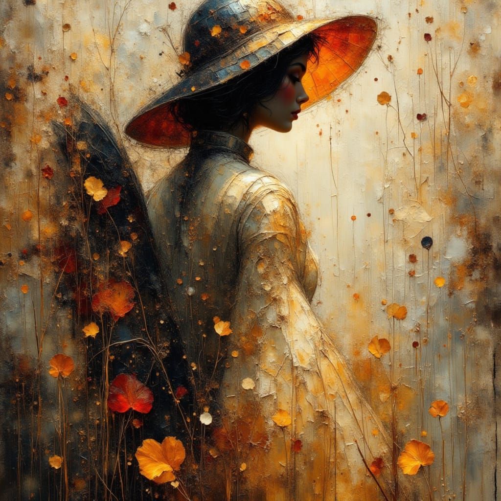This image shows a silhouetted figure against a detailed backdrop. The artwork evokes encaustic painting techniques with realistic rendering, reminiscent of earth textures.