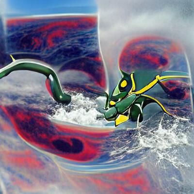 This image shows Rayquaza, a Pokémon that has lived for millions of years in the ozone layer. It appears to feed on water and particles in the atmosphere.
