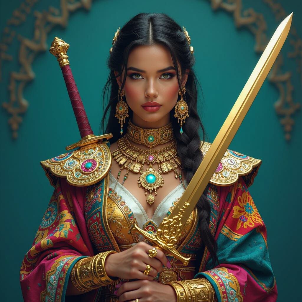 This image shows a beautiful woman in ornate, colorful clothing and gold jewelry, holding a gold sword. The artwork presents a hyperrealistic and fantastical aesthetic with intricate details, as 3D rendered digital art.