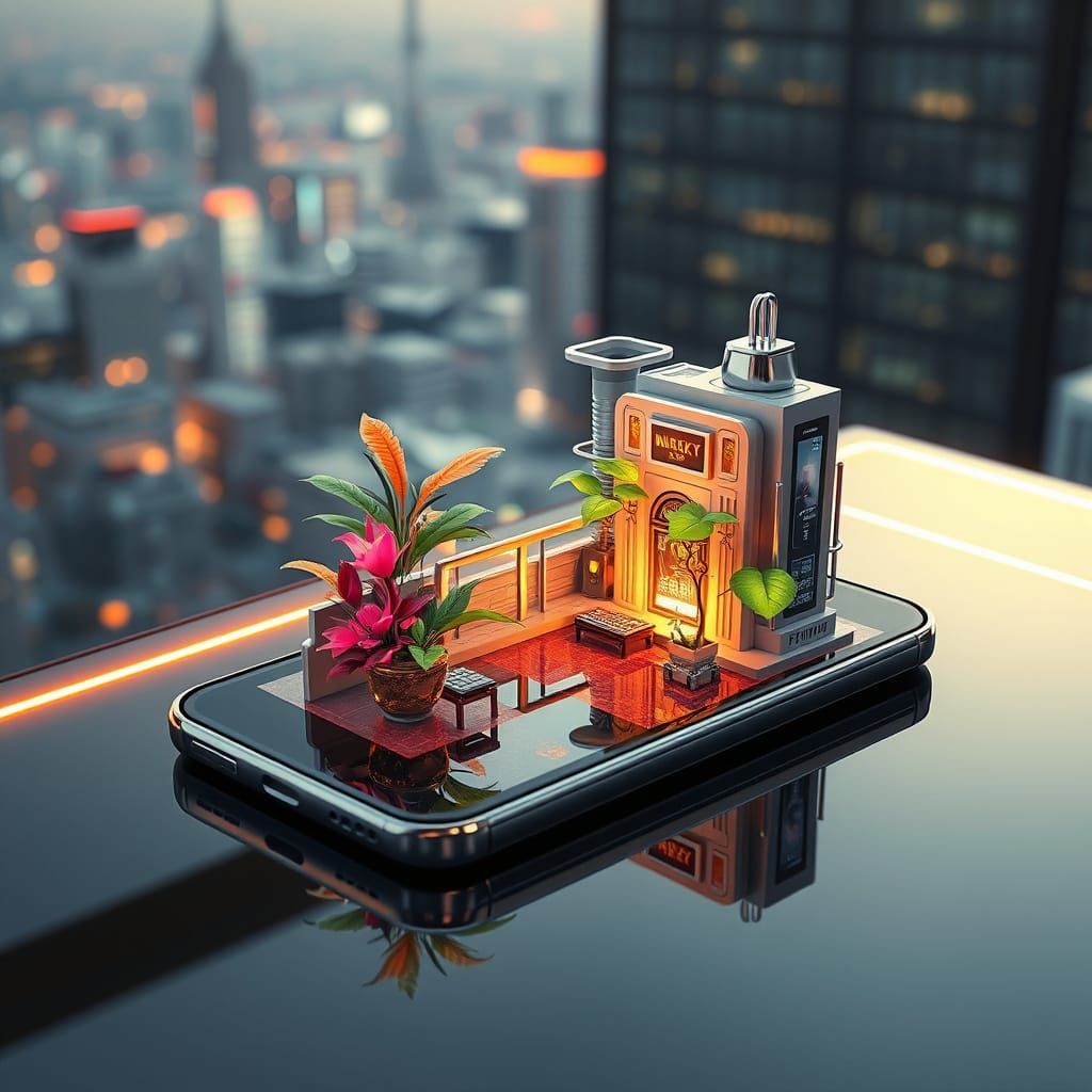 This futuristic penthouse apartment in Neo-Tokyo shines with vibrant holographic plants and sleek modern architecture, set against a warm golden hour cityscape.